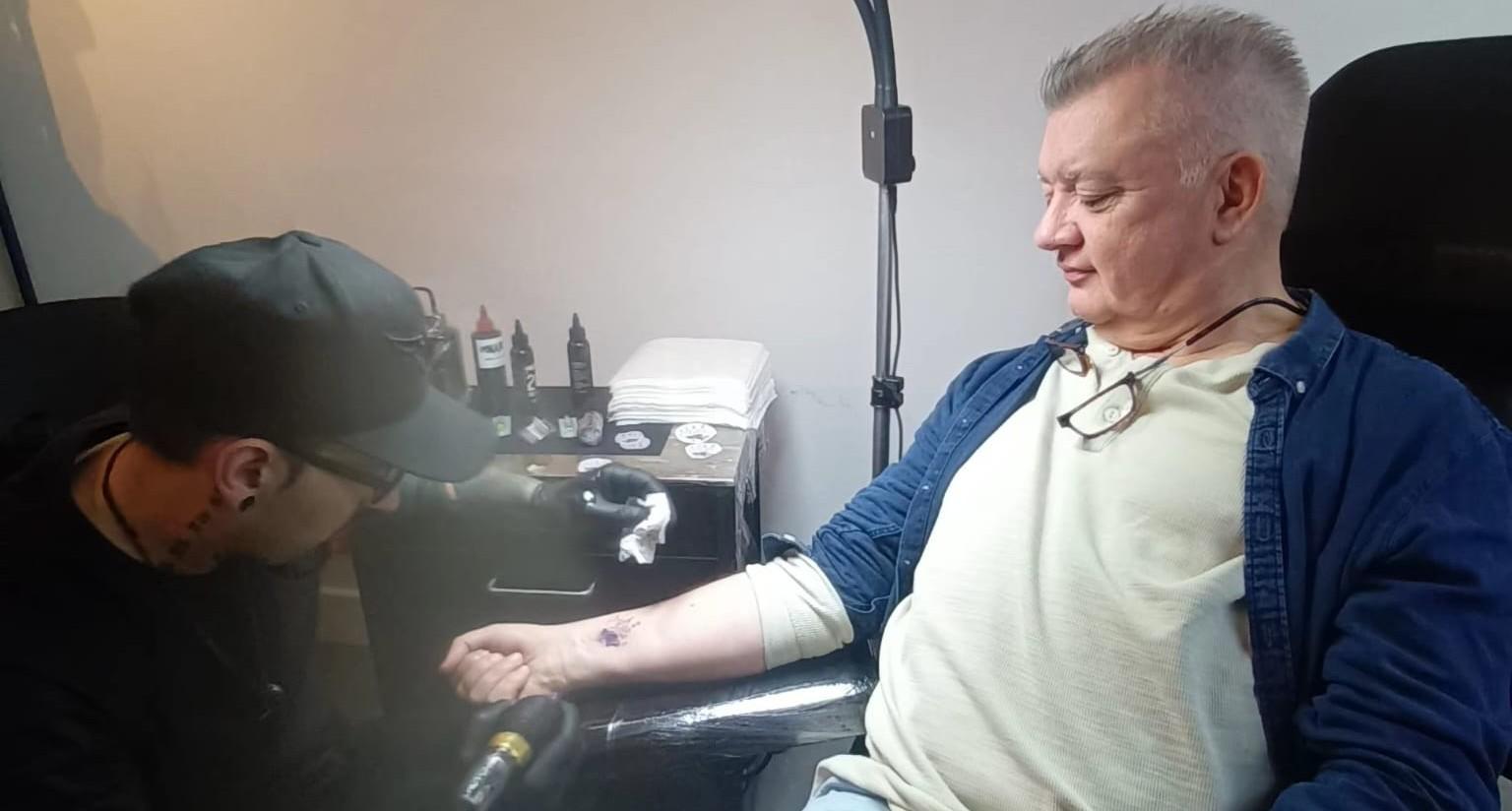 Fran in the studio getting little granddaughter Ellie's handprint tattooed.