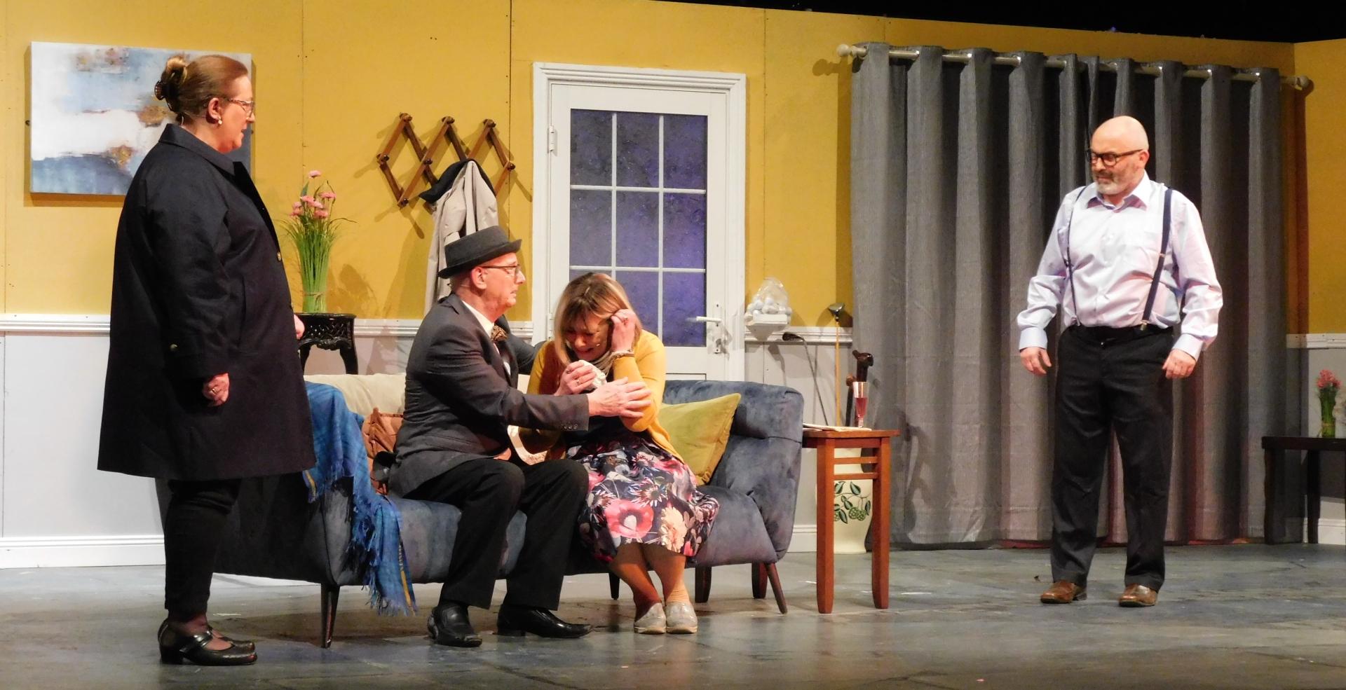 Martin Furlong (Liam Carey) consoles Brenda Barrett (Berna Hickey) as she believes that it is her fiance Norman that has been taken for cremation in Cash on Delivery.
