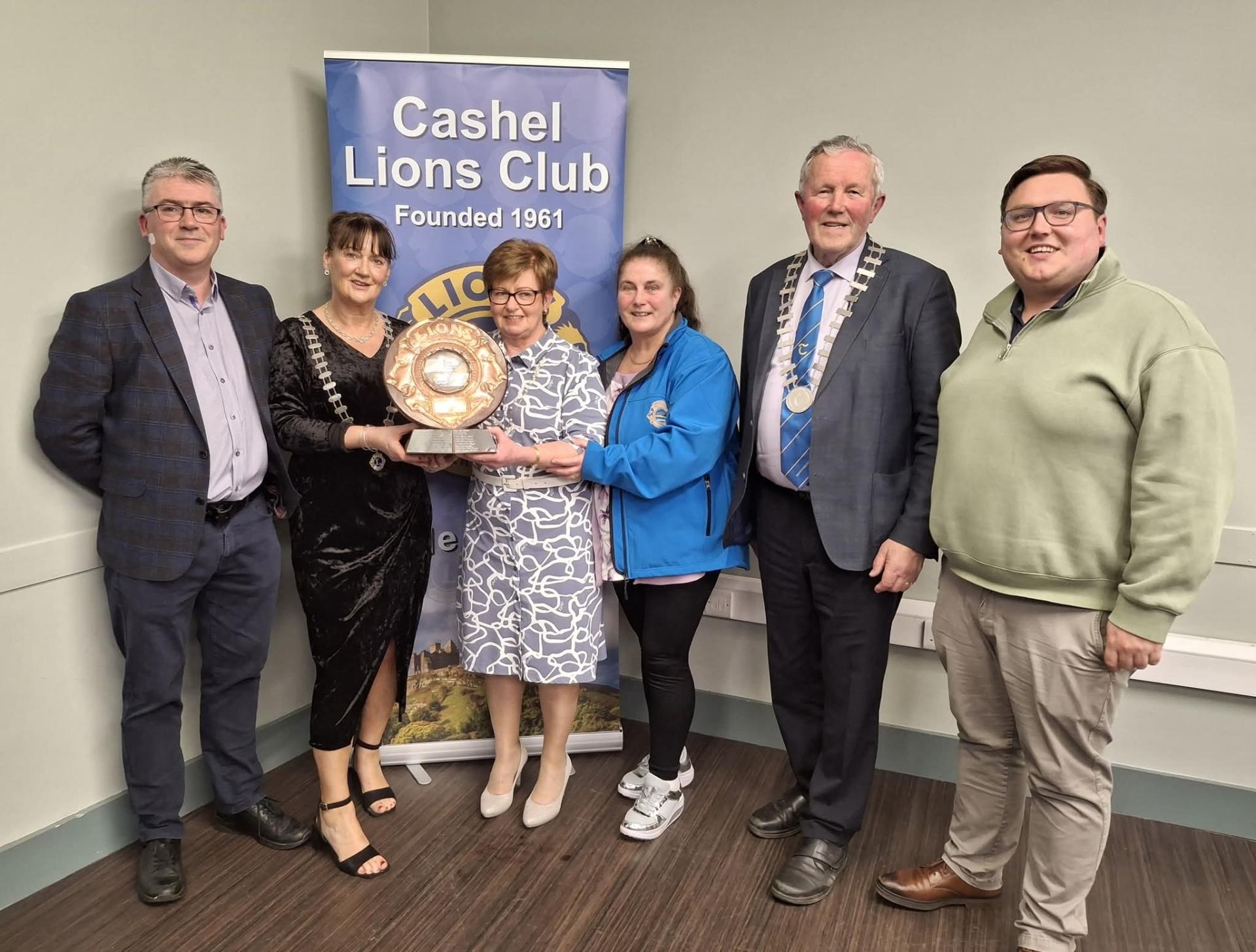 Councillor Liam Browne, Monica Slattery (Cashel Lions Club President), Marie Devitt (Cashel Person of the Year 2026), Councillor Roger Kennedy, and Councillor Declan Burgess at the Cashel Person of the Year Award Presentation in Halla na Féile.