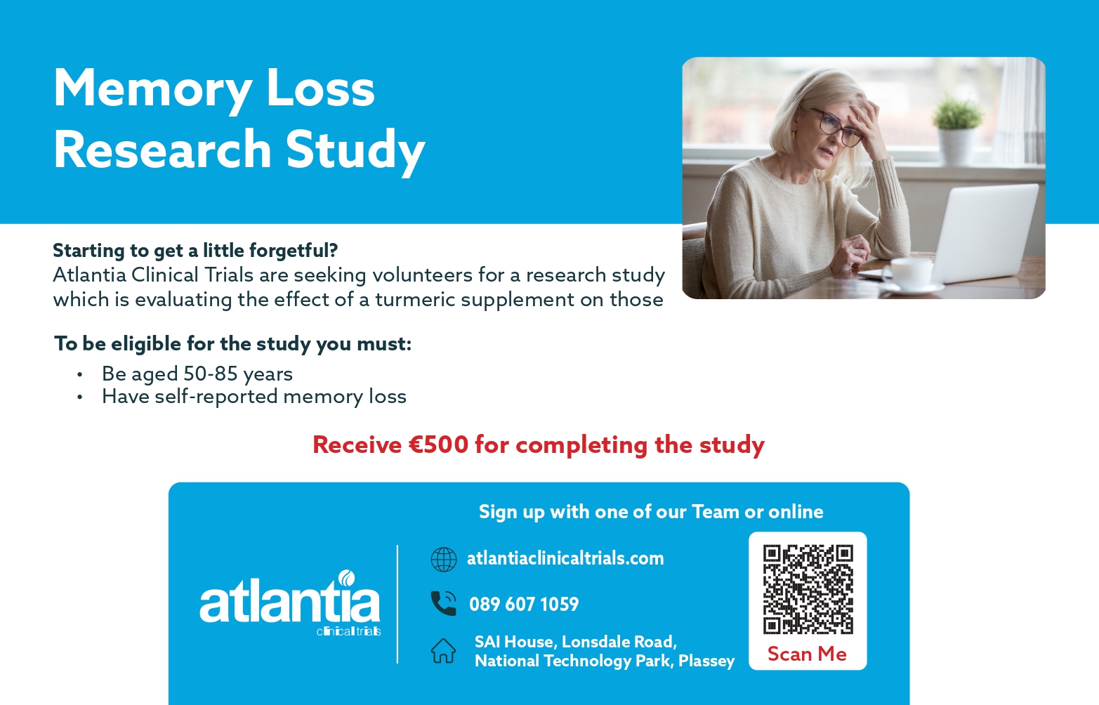 Atlantia are looking for participants aged 50-85 suffering from memory loss to take part in the 6-month long study. This memory loss does not need to be significant it can be as simple as forgetting your keys, what you wanted to buy in the shop or forgetting names when talking to someone.